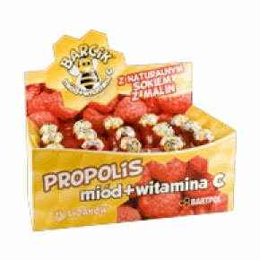 Skład : cukier biały, syrop glukozowy – baza masy karmelowej cukrowej, kwas cytrynowy E 330, miód pszczeli – 10 % - substancja czynna, proszek malinowy, aromat malinowy, witamina C (20 mg), koncentrat propolisu - 0,15 %, – substancje czynne, barwnik azurubina E 122